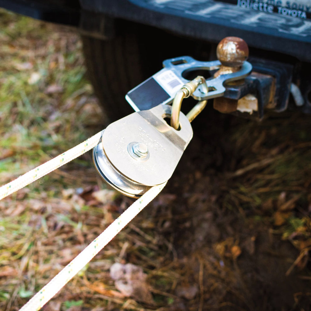 Multiply your pulling power by two, three or four times using pulleys. You can also use them to change the trajectory of the rope or the pulling angle! Their oscillating plates eliminate the need to thread the rope and allow them to be installed very quickly. In addition, they prevent the rope from coming out once closed. All our pulleys feature aluminum sheaves (a wheel with gouge) with shafts made to ensure a flawless operation and an efficiency of 98%, all without maintenance.